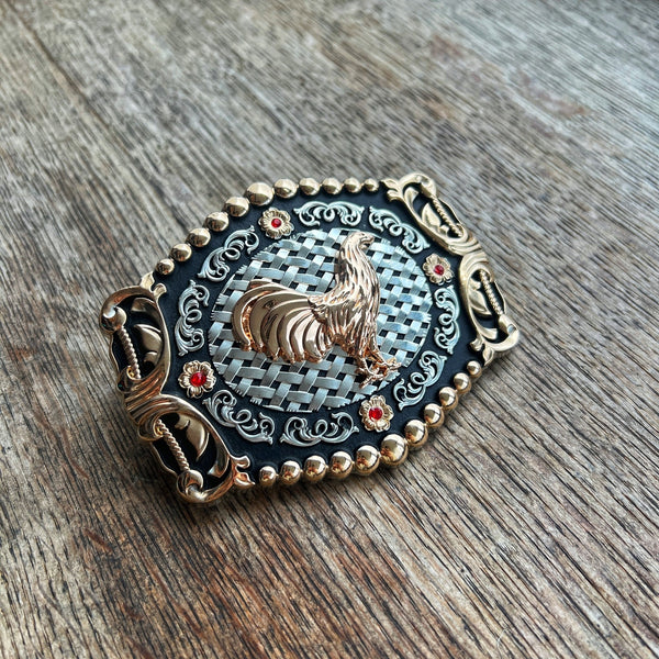 Hebilla para Cinto Gallo Plata/Oro con Piedras Rojas